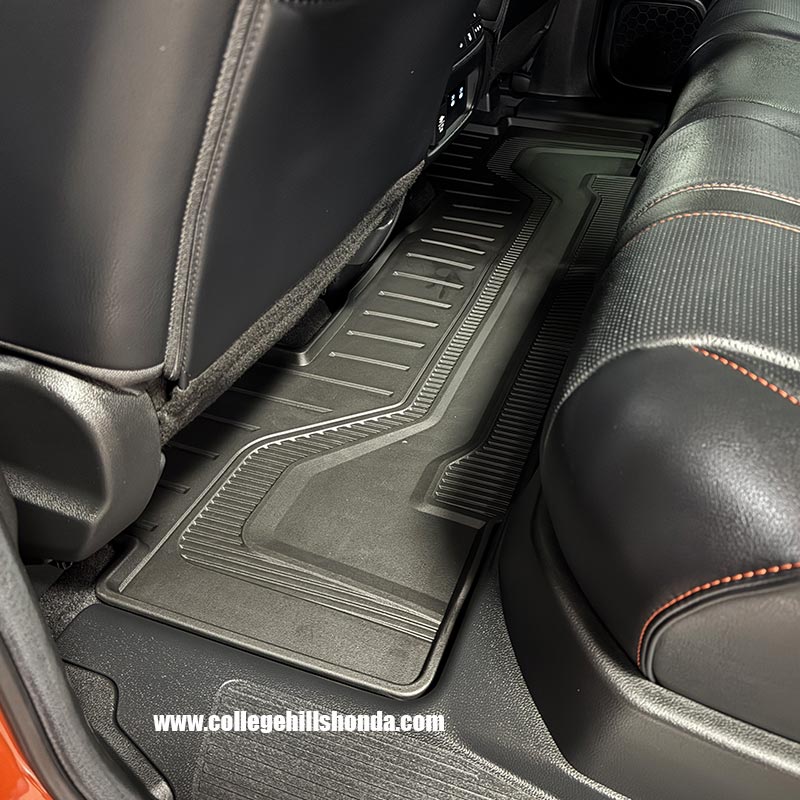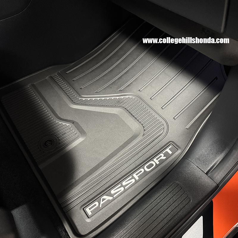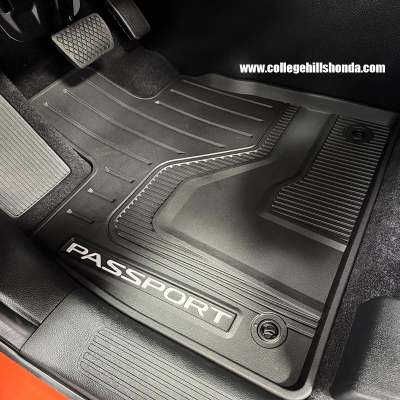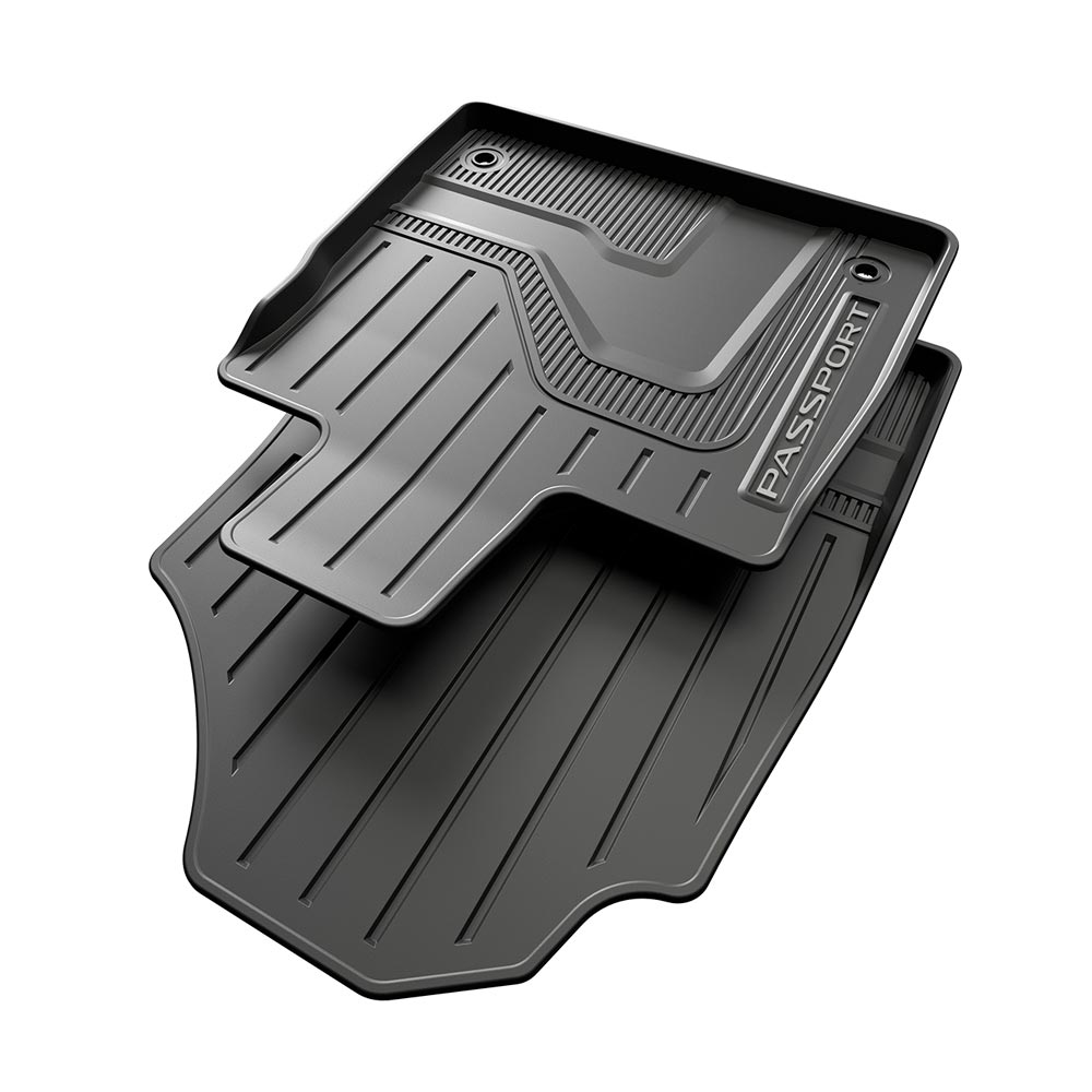 The extended sidewalls of these floor mats provide extra protection, shielding your original carpets from the wear and tear of everyday driving. The mats are specially designed to trap dirt and are made of durable, all-weather material. They can be easily cleaned with mild soap and water. A molded Passport logo gives them a custom appearance. It's important to note that these mats are not intended for use with other floor mats. Be sure to secure the mats with your vehicle's floor mat anchors. Includes front and rear seat mats.